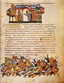 From the Madrid Skylitzes: Emperor Leo VI receives a Bulgarian embassy (top); the Bulgarian victory at Bulgarophygon in 896 (bottom). The account of the Vita Euthymii holds Zaoutzes and his corrupt clients responsible for the outbreak of the war, which saw several heavy Byzantine defeats.