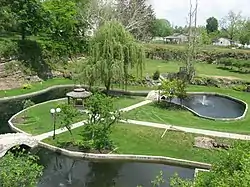 Sunken Gardens is a historic public park and garden complex located at Huntington, Huntington County, Indiana. It was designed by the Chicago Landscape Co. in 1923, and completed in 1929. The gardens include outcropped limestone walls on all sides, a horseshoe shaped pool, limestone foot bridges, two levels, and an automobile-related fieldstone bridge.[2]: 5