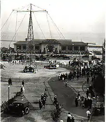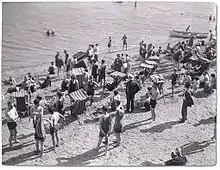 On June 28, 1922, Toronto Mayor Alfred Maguire opened the Sunnyside Bathing Pavilion to help bathers change for the swim in the lake. The building, constructed of concrete, cost $300,000. Each wing held an outdoor changing area, lockers and showers, the women's side on the east, and men's side on the west. It offered over 7700 lockers for patrons, a roof garden for 400. Admission fees were 25¢ for adults and 15¢ for children, and bathing suits and towels could be rented.[2] In the center was a staircase leading to an upper terrace which overlooked the change areas leading to a rear terrace which ran the full length of the building and overlooked the beach.