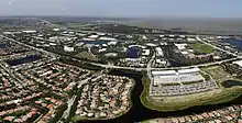Panoramic aerial view of Sawgrass Corporate Parkway in Sunrise, showing the American Express offices. The Everglades and Weston are also shown in the background.
