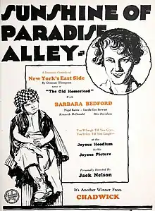 Sunshine of Paradise Alley is a 1926 American silent drama film directed by Jack Nelson and starring Barbara Bedford, Kenneth MacDonald, and Max Davidson.[1]