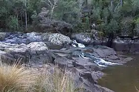 The river rises below Kellys Lookout within the Mount Careless Forest Reserve, southwest of Beaconsfield and west of Exeter. The river flows generally east-northeast, joined by two minor tributaries before reaching its confluence with the Tamar River at Robigana. From this point, the river enters the Bass Strait. The river descends 416 metres (1,365 ft) over its 27-kilometre (17 mi) course.[1] The river is transversed by the West Tamar Highway.