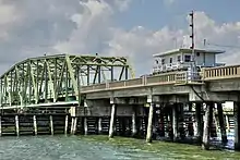 Until late 2018, road access to Surf City was mainly via the Topsail Island Swing Bridge, a failing steel truss swing-span bridge, built in 1954, which crossed the Intracoastal Waterway.[8] Planning for a replacement bridge began in 2010,[9] with construction beginning in September 2016. It opened in December 2018, a year ahead of schedule.[10] Costing US$54 million, the 3,800 feet (1,200 m) fixed-span high rise bridge, with a vertical clearance of 65 feet (20 m), allows the passage of vessels at any time and eases traffic flow to and from the community. The 50 feet (15 m) wide bridge provides two lanes for traffic, shoulder bicycle lanes, and a multi-use path. The unusually wide design is intended to permit three lanes for hurricane evacuations. The contractor was scheduled to remove the old bridge by March 31, 2019. In a letter to residents in January, the Town's mayor, Doug Medlin said, "NCDOT and Balfour Beatty understood the sentimental relationship that the Town of Surf City had for our Swing Bridge. We were given the turn bridge control panel and key as well as the cornerstone from when the bridge was first constructed. These items will be displayed in the new Surf City Town Hall as a historical memorial."[11]