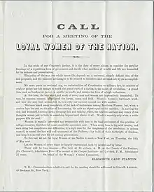Susan B. Anthony is known for her leadership in the long campaign for women's right to vote in the United States and also abroad. She indicated her interest as early as 1852, when she attended the National Women's Rights Convention in Syracuse, New York. She was also a vigorous opponent of slavery. In 1863, during the American Civil War, she and Elizabeth Cady Stanton organized the Women's Loyal National League, the first national women's political organization in the U.S.[18] It collected nearly 400,000 signatures on petitions to abolish slavery in the largest petition drive in the nation's history up to that time.[19]