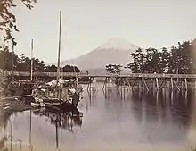 At first working in sericulture, Suzuki often traveled to Yokohama, where he soon apprenticed at the Yokohama photographic studio of Shimooka Renjō in 1867.[4] In 1872–1873 he was commissioned by J. R. Black, publisher of The Far East, to produce a photographic series documenting rural life. Images from this series continued to appear in Suzuki albums until the 1880s.[5] In November 1873 Suzuki set up his own studio, producing portraits and souvenir albums. The same year, Okamoto Keizō 岡本圭三,[6] a successor of his at Shimooka's studio, married Suzuki's daughter, and Okamoto joined the Suzuki family (muko-iri again). Okamoto became Suzuki Shin'ichi II, and the older photographer thereupon changed his own name.[7] About this time Suzuki may have studied photography under Yokoyama Matsusaburō.[8] In 1884 he moved to a newly built, western-style two-storey studio. A branch studio was opened in Kudanzaka, Tokyo and operated by Suzuki II.[9] Suzuki's photographs were highly acclaimed and he won an award for them in 1877, and in 1889 he and Maruki Riyō were commissioned to photograph Emperor Meiji and his wife. Purchasers of his works were mostly foreign residents and visitors, and in addition to sales from his own studio, Suzuki's photographs were distributed by Sargent, Farsari & Co.[10] His studio was advertised as early as 1880, in Keeling's Guide to Japan, and subsequently in the Japan Directory until 1908, offering daguerreotypes, photographs (including large format hand-coloured albumen prints), and Suzuki's innovation of photographs printed on porcelain, the latter selling for 12 yen each.[11] These advertisements indicate that from 1893 the Yokohama studio was run by I. S. Suzuki, that is, Suzuki's son Izaburō.[12] Suzuki Shin'ichi retired in 1892 and he died in December 1918 at the age of 83.[13]