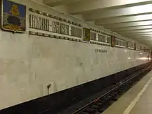 Built according to a standard design in 1978, the station features pillars faced with white marble and accented with vertical strips of anodized aluminum. The walls are also white marble and are decorated with friezes containing the names and coats of arms of the various cities and towns surrounding Moscow. Sviblovo's architect was Robert Pogrebnoi.