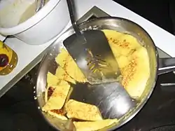 Pancakes are also called Flädle and are usually very thin and fried in oil. They may be eaten as a whole with savory or sweet accompaniments, or cut in stripes and added to soups.