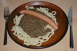 Also originally Swabian is Linsen mit Spätzle, a dish featuring lentils cooked in a vinegar broth and served over spätzle. They are often served with Vienna sausages or smoked bacon.