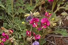 This species of pea usually grows near watercourses or floodplains near creeks or rocks holes in inland Australia, mostly in the Northern Territory, but there are also records from South Australia, Queensland and New South Wales.[2][3][4][5][6]