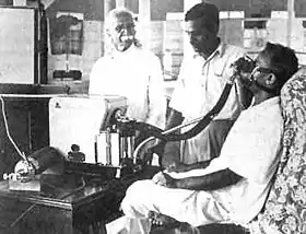 "Pure, objective science .. deployed as the handmaiden of spirituality":[8] Kuvalayananda watching an experiment on oxygen consumption in yogic practice at his Kaivalyadhama Health and Yoga Research Center, Lonavla[9]