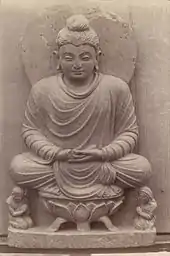 1896 photo of a Buddha statue seated on a lotus throne in Swat