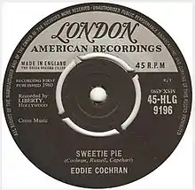 "Sweetie Pie" is a song written by Eddie Cochran, Jerry Capehart, and Johnny Russell and recorded by Eddie Cochran. It was recorded in 1957 and released posthumously as a single on Liberty F-55278 in August 1960. In the UK the single rose to number 38 on the charts.[1][2][3][4] The U.S. release did not chart. The flip side, "Lonely", reached number 41 on the UK singles chart. Keld Heich has recorded the song in 2010.[5]