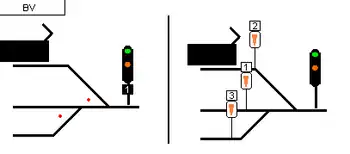 no aspect Prewarning, reduce speed to be able to stop at the signal after next, which is showing the 'stop' aspect and is closer than the normal braking distance to the next signal. Signal présentant un feu orange et un V allumé en dessous