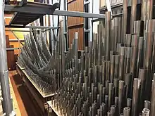 It is in six divisions, five manuals plus pedals, and is the largest tracker action organ ever built, with 131 speaking stops served by 200 ranks of pipes consisting of 10,244[3] pipes. It is a neo-baroque organ in style.