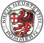 Historically, within the current boundaries of Kamień County was located Neustettin District, which existed from 1816 to 1945. Its seal depicted a red red grffin with yellow (golden) claws and beak. It faced to the viewr's left, stood on its back feet, and had risen wings. It held a white (silver) Iberian style escutcheon (shield) with a red cross on it. It was placed within a white (silver) escutcheon (shield), which was encircled by a white circle that featured two rows of text with black capitalised letters. The top text read Kreis Neustettin, which in translation from German, means Neustettin District or Szczecinek District. The bottom text read Pommern, which means Pomerania.[2][3]