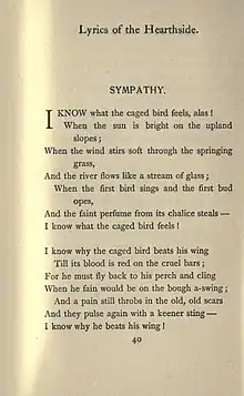 "Sympathy" was first published in 1899 in Dunbar's poetry collection Lyrics of the Hearthside.[6] He had previously published a poem also titled "Sympathy" in 1893.[2]:xxii