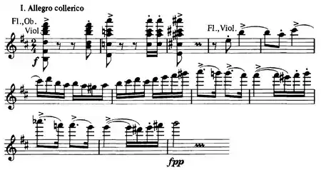 I have tried to sketch a man who storms thoughtlessly forward in the belief that the whole world belongs to him, that fried pigeons will fly into his mouth without work or bother. There is, though, a moment in which something scares him, and he gasps all at once for breath in rough syncopations: but this is soon forgotten, and even if the music turns to minor, his cheery, rather superficial nature still asserts itself.[7]