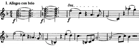 The first movement's opening F-A-F motto is followed immediately by a passionato theme; a descending sequence which bears a strong resemblance to a phrase[lower-alpha 1] from Robert Schumann's Third Symphony, the 'Rhenish'. Brahms' stay in Wiesbaden (on the Rhine) during the composition of his Third Symphony may also have brought back memories of his early days in Düsseldorf in the home of Robert and Clara Schumann.[3] It was there in 1853 where the young Brahms and Robert Schumann had experimented with 'musical cyphers' for Joachim's amusement.[5]