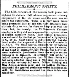 Saint-Saëns' decision to compose an actual symphony in response to the Philharmonic Society's request was unusual. First, almost thirty years had passed since the forty-nine year old composer had last written a symphony (in 1859), and his reputation as a concert composer derived principally from his piano concertos and symphonic poems. Second, the Society's interest in an orchestral or symphonic work by a French composer would have generally precluded an actual symphony since, as a genre, it had been largely ignored by French composers.[11] While symphonies were regularly performed in Parisian concert halls, appearing in more than half of the "Grands concerts" series that were comprised by the orchestral societies of Jules Pasdeloup, Édouard Colonne, and Charles Lamoureux, almost all were by Austro-German and Nordic composers, especially those of Beethoven, Mendelssohn, and Schumann.[12][13] French symphonic composers of the late eighteenth and early nineteenth century, such as Gossec, Leduc, or Méhul, were virtually unknown by the later nineteenth century. Symphonic efforts by later French composers, including those by Gounod and the early symphonies by Saint-Saëns himself, were very rarely performed, while the youthful symphony of Bizet would remain unknown until 1933. Rare exceptions, such as the 1869 premiere of Bizet's Roma Symphony by Pasdeloup at his Concerts populaires series, were not warmly received by Parisian concertgoers.[14]