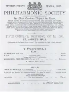 The premiere, conducted by Saint-Saëns himself, took place at the Philharmonic Society's concert of 19 May 1886, at St James's Hall, London. In the opening half of the concert, Saint-Saëns was the soloist in Beethoven's Fourth Piano Concerto, with Arthur Sullivan conducting. In the second half, in keeping with the Society's tradition of inviting composers to perform their own works, Saint-Saëns himself conducted the performance of his new symphony. For his efforts, Saint-Saëns received an honorarium of £30.[lower-alpha 4]