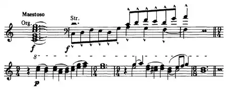 It has been commonly noted that the opening theme of the symphony recalls the "Dies irae" by using the first five pitches of the well-known medieval chant. Given the dedication "to the memory of Franz Liszt", who died in 1886, it has been suggested that Saint-Saëns made intentional use of the motif to suggest the "resurrection and eternity" of Liszt.[27] As various scholars have pointed out, however, the original dedication was intended "as a homage" to Franz Liszt the man, and not the memory, since his death occurred between the London premiere of the work and its eventual publication.[28] In a letter dated June 19, 1886, Liszt wrote to Saint-Saëns, acknowledging both the intended dedication and "the success of the symphony in London".[29] In Fallon's view, the work is non-programmatic and the coincidence of pitches with the "Dies irae" insignificant.[30] In Deruchie's analysis, Saint-Saëns may have intended the idea of resurrection linked to the "Dies irae" with the renewal of the symphonic genre itself.[31] In a 1918 letter to Pierre Adjutant, Saint-Saëns wrote "if a symphony could claim the honor of renewing the symphonic genre, it would be my symphony in C minor, on account of its unusual division and its use of the organ."[32]