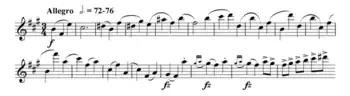 An oboe triplet figure then reveals the warm theme in G major of the Adagio non troppo section, a contrast to the prior cold landscape.[22] The texture expands contrapuntally for the first time; the tonality brightens to B major and, after a climax, wanes to G major again.[23] The full strings are soon disturbed by an "evil" motif on woodwinds, playing the shivering element from the work's opening; tension between wind and strings intensifies as tonality shifts within instrumental groups in their respective directions.[24] With a further clash, the music is menaced by the snare drum at a tempo (quarter note ♩=116) faster than that of the orchestra, and at its climax comes the composer's instruction to the snare drummer to improvise "as if at all costs he wants to stop the progress of the orchestra".[25] (This instruction is not included in the 1950 edition of the score, being replaced by a written rhythmic line and instruction "cad. ad lib." after a few bars.[9]) The warm theme eventually triumphs in a sustaining grandeur, as is affirmed by the snare drum actually joining the orchestral fanfare.[25] When all subsides, echoes in woodwinds are heard and a solitary clarinet is left to mourn in a tragic atmosphere, recapturing ideas from the whole movement:[26] "Who would have thought that so much could have come out of a gently waving viola line in empty space?"[27]