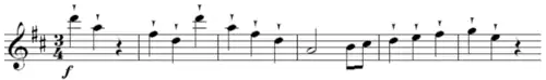 4 time, dominated by a motif established in the opening bars and consisting of two descending pairs of notes, firmly establishing the home key by using only notes in the D major triad.