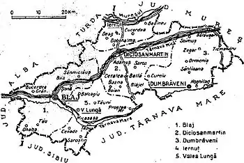 Administratively, Târnava-Mică County was made up of three cities Diciosânmartin, Ibașfalău (Elisabetopol, Elisabethstadt, Erzsébetváros), and Blaj and initially four districts (plăși):[1]