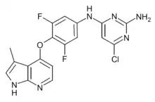 • CC1=CNC2=NC=CC(=C12)OC3=C(C=C(C=C3F)NC4=CC(=NC(=N4)N)Cl)F