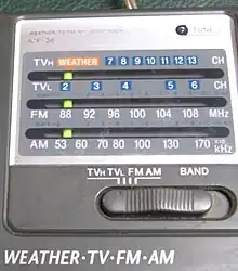 Close-up view of the audio bands on a Sony ICF-36 portable radio, manufactured in 2001. The TV audio bands are obsolete and not usable with digital TV channels.