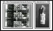 The TX-0, for Transistorized Experimental computer zero, but affectionately referred to as tixo (pronounced "tix oh"), was an early fully transistorized computer and contained a then-huge 64K of 18-bit words of magnetic-core memory. Construction of the TX-0 began in 1955[1] and ended in 1956.[2][3][4] It was used continually through the 1960s at MIT. The TX-0 incorporated around 3,600 Philco high-frequency surface-barrier transistors, the first transistor suitable for high-speed computers.[5] The TX-0 and its direct descendant, the original PDP-1, were platforms for pioneering computer research and the development of what would later be called computer "hacker" culture. For MIT, this was the first computer to provide a system console which allowed for direct interaction, as opposed to previous computers, which required the use of punched card as a primary interface for programmers debugging their programs.[6] Members of MIT's Tech Model Railroad Club, "the very first hackers at MIT", reveled in the interactivity afforded by the console, and were recruited by Marvin Minsky to work on this and other systems used by Minsky's AI group.[7]