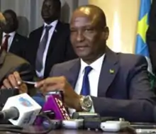 He again served as governor of Unity State from 30 September 2005.[9] In the April 2010 elections the state electoral body announced that Taban Deng Gai won by 137,662 votes, beating his cousin and runner-up Angelina Teny who won 63,561 votes. The results were heavily disputed, with Teny accusing Deng of having used militants to intimidate her supporters.[2][10] The election contributed to the estrangement of Deng from Teny, and, by extension, from Machar.[2] When the South Sudanese Civil War broke out, Deng initially joined the SPLM-IO rebels of Riek Machar, and became the latter's second-in-command.[4] Deng eventually became the rebel chief negotiator with the South Sudanese government under President Salva Kiir Mayardit. In August 2015, the SPLM-IO and the government agreed to a power-sharing deal which left Deng deeply dissatisfied, as he was supposed to be appointed mining minister instead of petroleum minister, as he had wished. He consequently began to secretly collude with Kiir's forces. Although the SPLM/A-IO military intelligence discovered his activities, the rebel leadership refused to believe the intelligence. In April 2016, he resigned as rebel chief negotiator, claiming that had to fully devote himself to his new position as mining minister.[11] Instead, Deng fully defected to the government after the Battle of Juba in July 2016, and officially replaced Machar as First Vice President.[4] A substantial number of insurgents followed him, and became known as the Juba faction of the SPLM/A-IO. They subsequently began to fight alongside the government force against Machar's loyalists,[12][13] resulting in Deng being regarded as "traitor" by other rebels.[13]