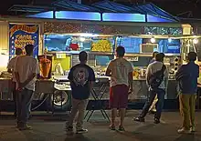 Colloquially referred to as Loncheras,[1] Taco trucks have become an iconic symbol of Mexican culture in the United States. Popularized in Los Angeles, Loncheras are often characterized by rough exteriors, bright colors, and bold murals.[2] Operators have been able to build loyal clientele using familiar parking spots, social media, and after-dark hours.[3] Though taco trucks are a staple food for Angelenos of every race, Loncheras in Los Angeles are chiefly owned and operated by Hispanic and Latino families in low to moderate-income areas.[2] Since Raul Martinez's first mobile truck success, taco trucks have continued to serve as windows of opportunity for migrant families and prospective chefs to earn a living. Taco trucks, like all Mexican street food, have allowed Mexican Americans to stay connected to their heritage while adjusting to a new country, community, and way of life.[4] Success among authentic Mexican taco trucks later inspired "fusion taco trucks". [1] Roy Choi's Kogi BBQ food truck, a Korean-Mexican short rib taco truck, is considered to be the first "fusion" taco truck in Los Angeles.[1] The opening of Choi's truck marked a gastronomic explosion on the Los Angeles taco truck horizon. Both regular and fusion taco trucks help meet the high demand for fast, affordable, and convenient street food in the Golden city.