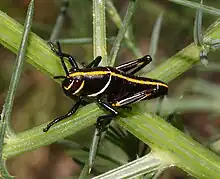 Taeniopoda eques, the western horse lubber grasshopper, is a relatively large grasshopper species of the family Romaleidae found in arid and semi-arid parts of southwestern United States to central and southwestern Mexico.[1][2] Most populations are identifiable by their shiny black bodies with contrasting yellow markings, but some adults (frequent in parts of Mexico, rare in the United States) are mostly yellowish, orangish or greenish. The species is unique in using its black coloration to thermoregulate and in being chemically defended. The aposematic coloration warns vertebrate predators of its unpalatability and allows the grasshopper to roost conspicuously upon shrubs.[3][4]