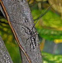 This species may have two generations per year (bivoltine). Adults can be found from January to March and from September to December.[3] These beetles feed on Artocarpus altilis (breadfruit).[4] Larvae usually drill into wood and can cause damages.