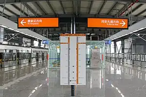 There are 2 island platforms at this station, located separately on two floors. The one of Line 4 is on the upper floor, while the other one on the lower floor is reserved for Phase III of Line 18, which is currently under planning.