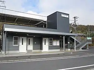 The station has two opposed ground-level side platforms connected by a footbridge. The station is attended
