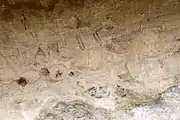 The Takiroa Historic Area features several Māori drawings made from ochre, bird fat, and charcoal.[2][3] The subject matter present in the shelter is variable. Some drawings have been interpreted as people and animals, such as birds.[4] Depictions of European settlers are also apparent, which feature the likes of horses and ships.[4]