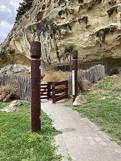 The Takiroa Rock Art Shelter is an archaeological site located along State Highway 83 near Duntroon, New Zealand.[2] The site features a limestone rock shelter containing several pieces of Māori rock art, dating between 1400 and 1900 AD.[3] The shelter is open to public viewing, with fences constructed to protect the artwork from damage.