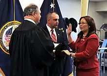Duckworth being sworn in as Assistant Secretary of Public and Intergovernmental Affairs for the United States Department of Veterans Affairs, by Judge John J. Farley with her husband Bryan Bowlsbey beside her