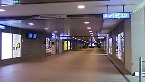Only very few changes have been made to the Tampere railway station over the years. In contrast, the area around the station has changed. In 1983, a shopping and parking building was built on the south side of the station. In 1989, a 98-metre shopping tunnel, known as Asematunneli (station tunnel) was built throughout the station building, containing about twenty shops. Thus pedestrians no longer had to use the cramped and noisy underpass at Itsenäisyydenkatu. At the same time, the station's ticket office moved to its new premises. A new storage area for luggage was built next to the ticket office in 1994. The new Matkakeskustunneli tunnel passing under the railway yard was built in 2008,[3] and in 2012 a third, 60-metre long Pendolino tunnel parallel to the railway tracks was built, connecting the two previous tunnels.[14][15] The Pendolino tunnel was closed for passage in 2016.[16] In 2012 a new 75-metre long underpass tunnel under Rongankatu was opened for the use of pedestrians and bicyclists to help travel between Tammela and the city centre. The tunnel has elevator and stair connections to all platforms.[17]