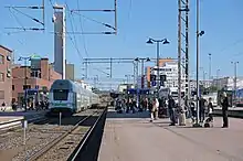 About 150 trains arrive at and depart from the Tampere railway station every day, with 4.7 million passengers using the station in 2017.[4] Most of the traffic is towards Helsinki. Tampere also has railway connections northwards, and towards the cities of Turku, Jyväskylä, and Pori. Pendolino trains go from Tampere to Helsinki, Kuopio via Jyväskylä, and Oulu via Seinäjoki.