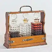 A Tantalus is a small wooden cabinet containing two or three decanters. Its defining feature is that it has a lock and key. The aim of that is to stop unauthorised people from drinking the contents (in particular, "servants and younger sons getting at the whisky"),[1] while still allowing them to be on show. The name is a reference to the unsatisfied temptations of the Greek mythological character Tantalus.