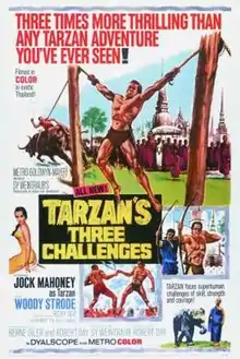Tarzan's Three Challenges is a 1963 British-American adventure film filmed in Metrocolor. The twenty-fifth film of the Tarzan film series that began with 1932's Tarzan the Ape Man, it is a follow-up to 1962's Tarzan Goes to India.[3] The film was Jock Mahoney's second and final turn as the apeman, was produced by Sy Weintraub, written by Robert Day and Berne Giler, and directed by Robert Day.[4] The film was released in June 1963, and was followed by Tarzan and the Valley of Gold in July 1966.