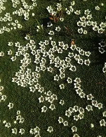 Tasmanian cushion plants are low growing, highly compact, woody, spreading mats that can grow up to 3 m in diameter, located mainly on the island of Tasmania. These mats are made up of tightly packed stems that grow at the same rate so that no apical rosettes protrude above the rest. The term cushion plant refers to a characteristic growth habit adopted by various species from a range of families to adapt to alpine and subalpine environments and areas of high latitude.[1] They are adapted to grow in low nutrient areas and typically have deep taproots. Cushion plants are very slow growing and do not grow high above ground; mounds typically remain under 30 cm high. Underneath the living surface of the cushion, the plants either allow dead leaves to persist or produce non-photosynthetic material, resulting in an insulating effect.