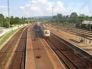 Tatabánya railway station (Hungarian: Tatabánya vasútállomás) is a railway station in Tatabánya, Komárom-Esztergom County, Hungary. The station opened on 15 July 1884.[1] The station is located on the main line between Vienna and Budapest (Line 1 Budapest–Hegyeshalom railway), Line 12 Tatabánya–Oroszlány railway and Line 13 Tatabánya–Pápa railway. The train services are operated by MÁV START.