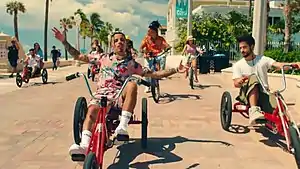 An accompanying music video was released simultaneously with the song.[77] The visual was directed by Gustavo Camacho, produced by Mastermind Entertainment, and filmed in Miami. It depicts Alejandro and Camilo having an "epic beach day" and having fun with some tricycles along with their friends, including Camilo's partner Evaluna Montaner and the Argentine actress Stefania Roitman.[25][29][32]