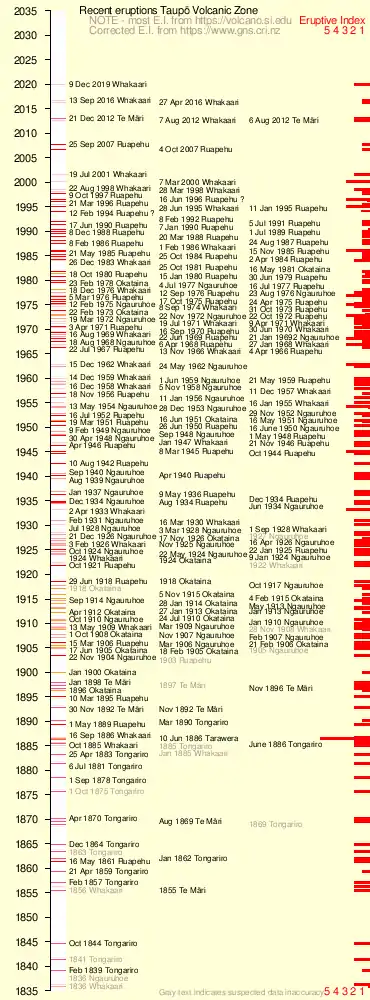 There are numerous volcanic vents and geothermal fields in the zone, with Mount Ruapehu, Mount Ngauruhoe and Whakaari / White Island erupting most frequently. Whakaari has been in continuous activity since 1826 if you count such as steaming fumaroles, but the same applies to say the Okataina volcanic centre.[3] The Taupō Volcanic Zone has produced in the last 350,000 years over 3,900 cubic kilometres (940 cu mi) material, more than anywhere else on Earth, from over 300 silicic eruptions, with 12 of these eruptions being caldera-forming.[4] Both the Taupō Volcano and the Ōkataina Caldera have had multiple eruptions in the last 25,000 years. The zone's largest eruption since the arrival of Europeans was that of Mount Tarawera (within the Ōkataina Caldera) in 1886, which killed over 100 people. Early Māori would also have been affected by the much larger Kaharoa eruption from Tarawera around 1315 CE.[5][6]