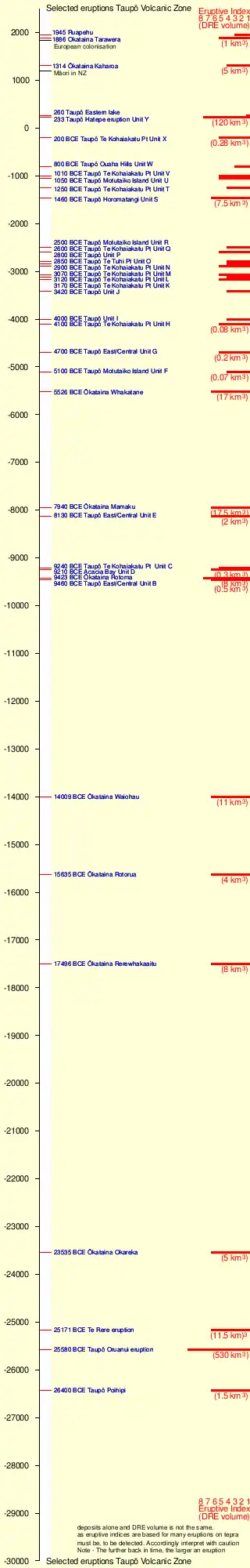 Taupō erupted an estimated 1,170 km3 (280 cu mi) of DRE material in its Oruanui eruption 25,580 years ago.[9] This was Earth's most recent eruption reaching VEI-8, the highest level on the Volcanic Explosivity Index.
