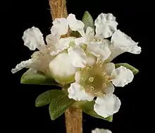 The shrub has an erect form and typically grows to a height of 3 to 4 metres (10 to 13 ft). It blooms between July and October producing white flowers.[2] It can be grown as an ornamental shrub in the garden where it is hardy and has dense foliage. The small white flowers grow in masses and the foliage is aromatic. The shrub is drought tolerant once established and will also tolerate light frosts.[1]